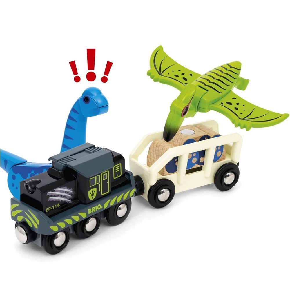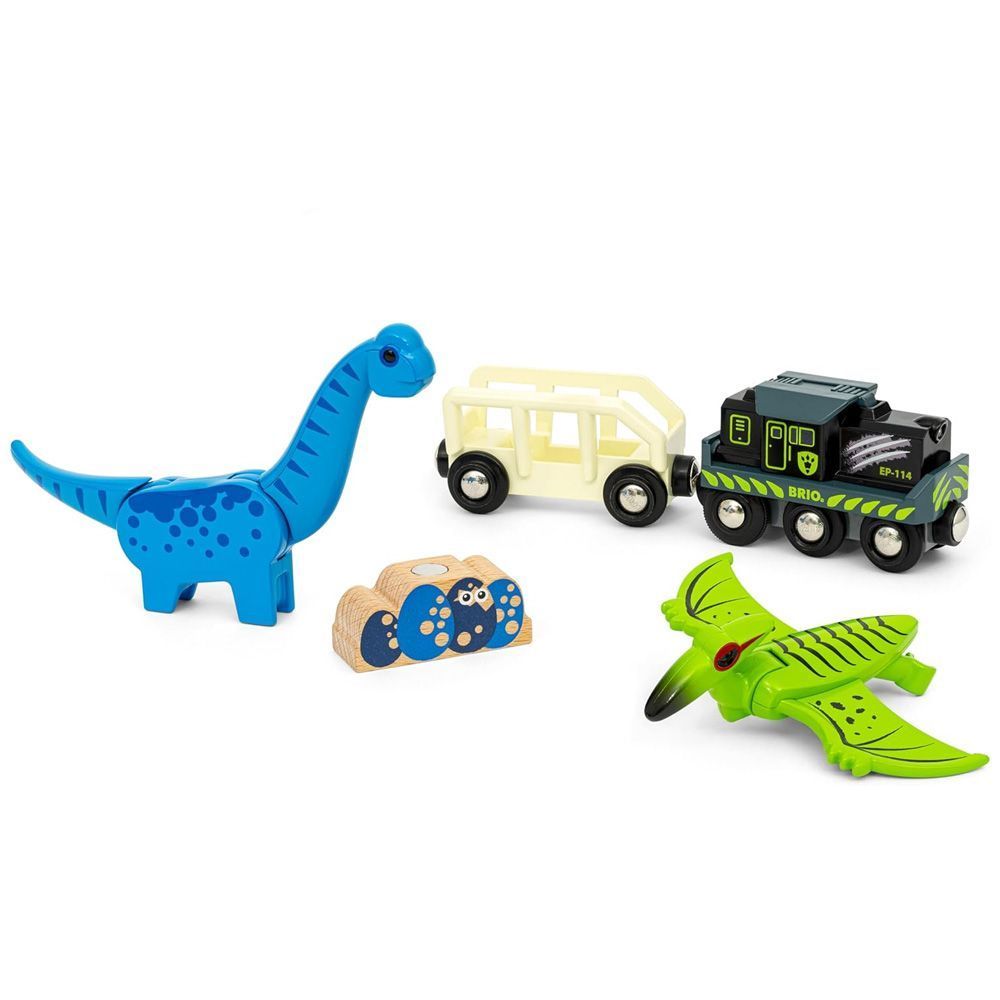 Динозавр подорожує доісторичним світом BRIO World! Відправляйтеся в доісторичну пригоду з набором Поїзд BRIO на батарейках з динозаврами (36096).