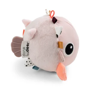М’ячик для активностей Puffee в пудровому кольорі створений для стимуляції відчуттів і розвитку моторики. Малюк може тримати рибку за м’які шипи й плавці, які приємно шарудять, досліджувати текстури та кольорові ярлички.