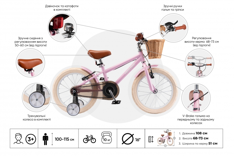 У комплектацію велосипеда входить 2 катафоти, дзвіночок на кермо, набір інструментів для збирання та обслуговування велосипеда, кошик з натурального ротанга, набір бічних навчальних коліс.