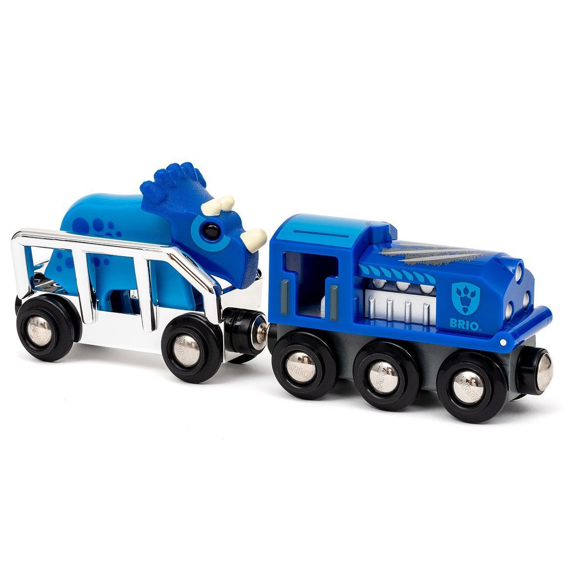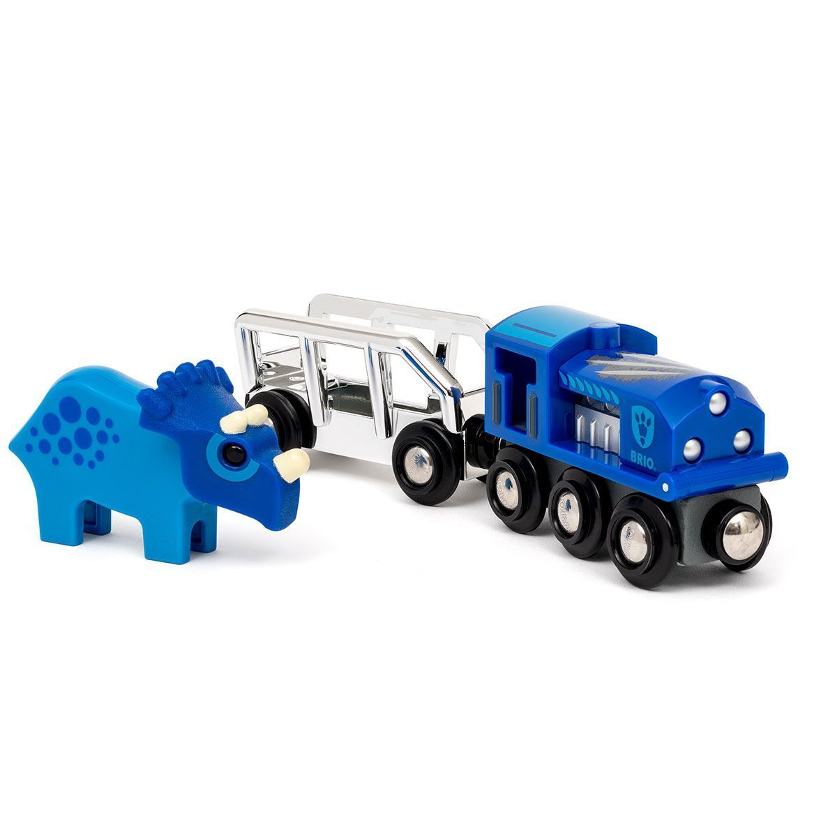 Зустрічайте ексклюзивну новинку 2025 року — поїзд BRIO Special Edition з динозавром! Цей унікальний поїзд у сріблясто-синьому оформленні прикрашає фігурка рідкісного синього трицератопса, якого можна перевозити у вагоні.